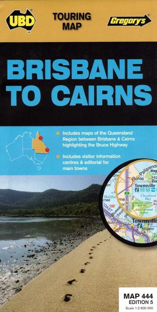 Brisbane to Cairns Map 444 UBD / Gregory’s, featuring both regional and street mapping for the respective regions. Each map includes a complete map of the region with all main roads shown, providing information for tourists and attractions along the way including things to do and places to see.