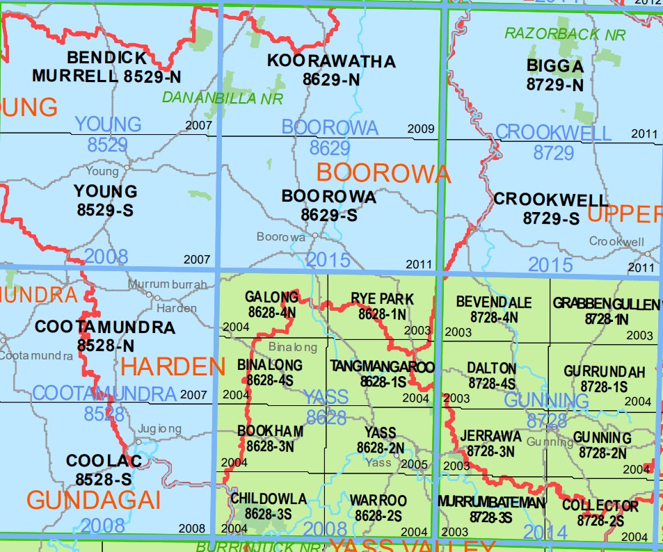 Click on the following link for a PDF copy of the full map index to 1000s of LPI topographic maps covering New South Wales.
