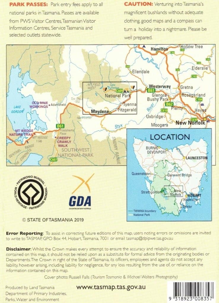National Park Map covering Tasmania’s Mount Field National Park at 1:50,000 scale, ideal for bushwalking.