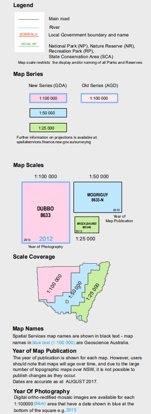 Click on the following link for a PDF copy of the full map index to 1000s of LPI topographic maps covering New South Wales.