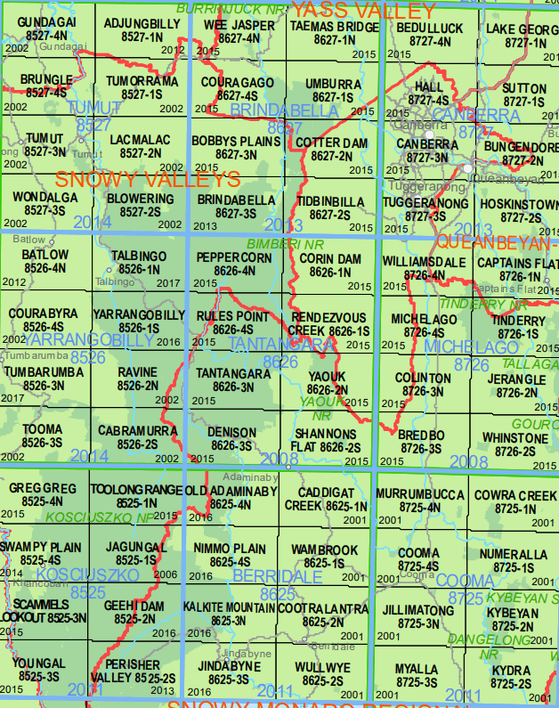 Click on the following link for a PDF copy of the full map index to 1000s of LPI topographic maps covering New South Wales.