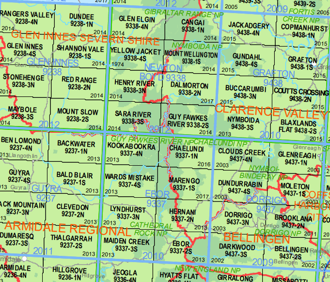 Click on the following link for a PDF copy of the full map index to 1000s of LPI topographic maps covering New South Wales.